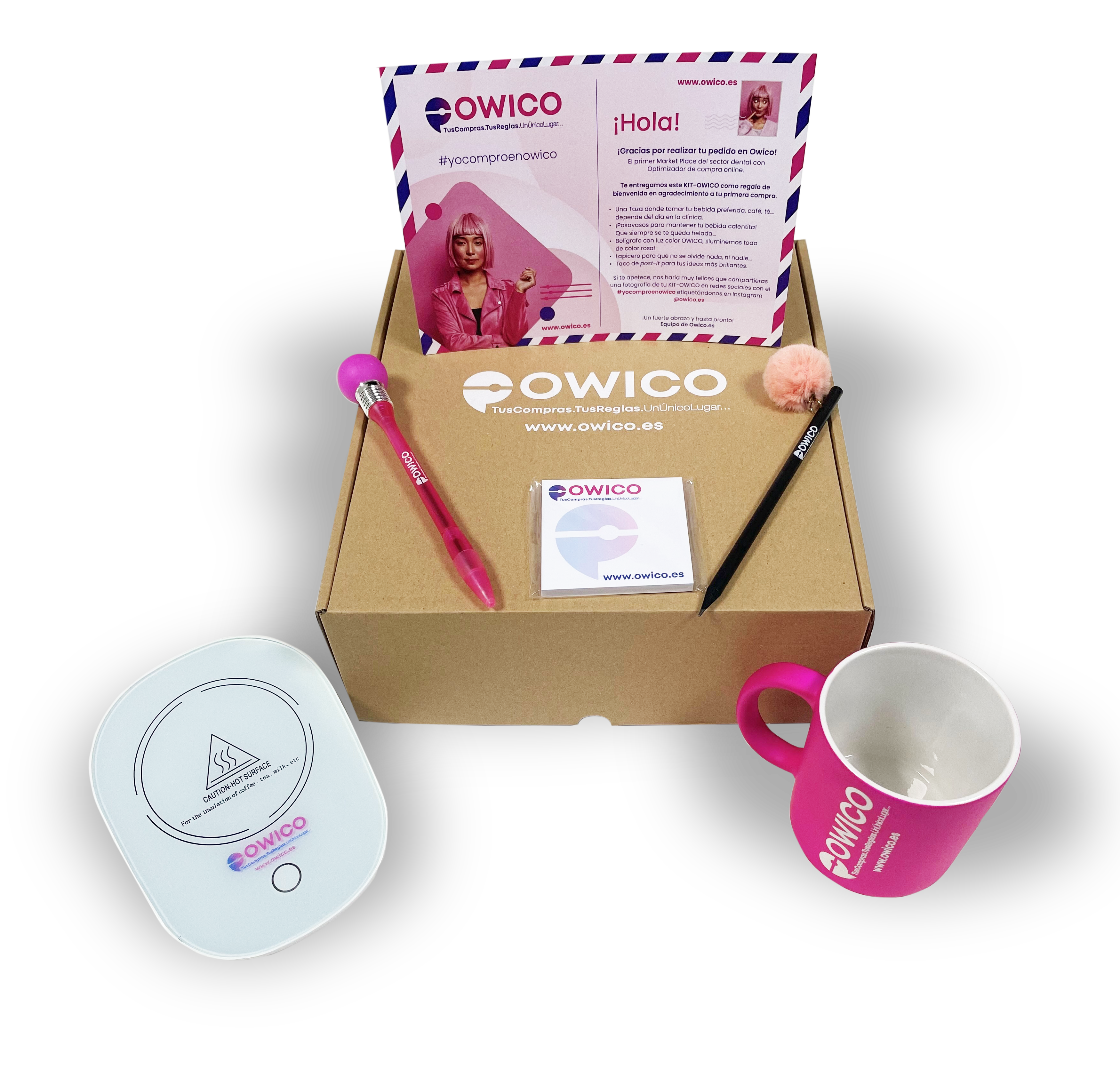 *Regalo de un kit de bienvenida compuesto de un posavasos Owico (mantiene el calor de tazas), una taza Owico, un set de papelería Owico compuesto de un boli con luz, un lápiz y un taco de notas adhesivas.